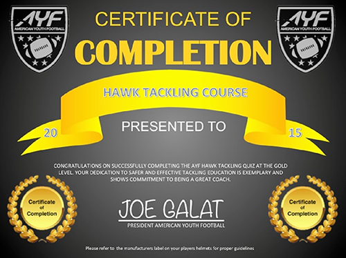 AYF members are responsible for selecting and establishing the parameters for training which are to be completed by their coaches and administrative personnel. AYF suggests that players, parents and coaches review the course materials at AYFcoaching.com, produced by Human Kinetics, a leader in sports training publications, also available is the book Coaching Youth Football, written by AYF president, Joe Galat. Another great resource is the NFHS free tackle coure available here.
