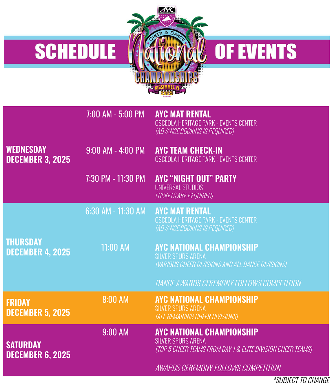 Pom ,  Hip Hop, D6 Cheer and D16 Cheer will compete on Thursday, December 4, 2025. All remaining cheer teams will compete on Friday, December 5, 2025. The top 5 highest scoring teams in each cheer division will advance to compete on “Super Saturday", December 6th, 2025, for the 2025 AYC National Championship.