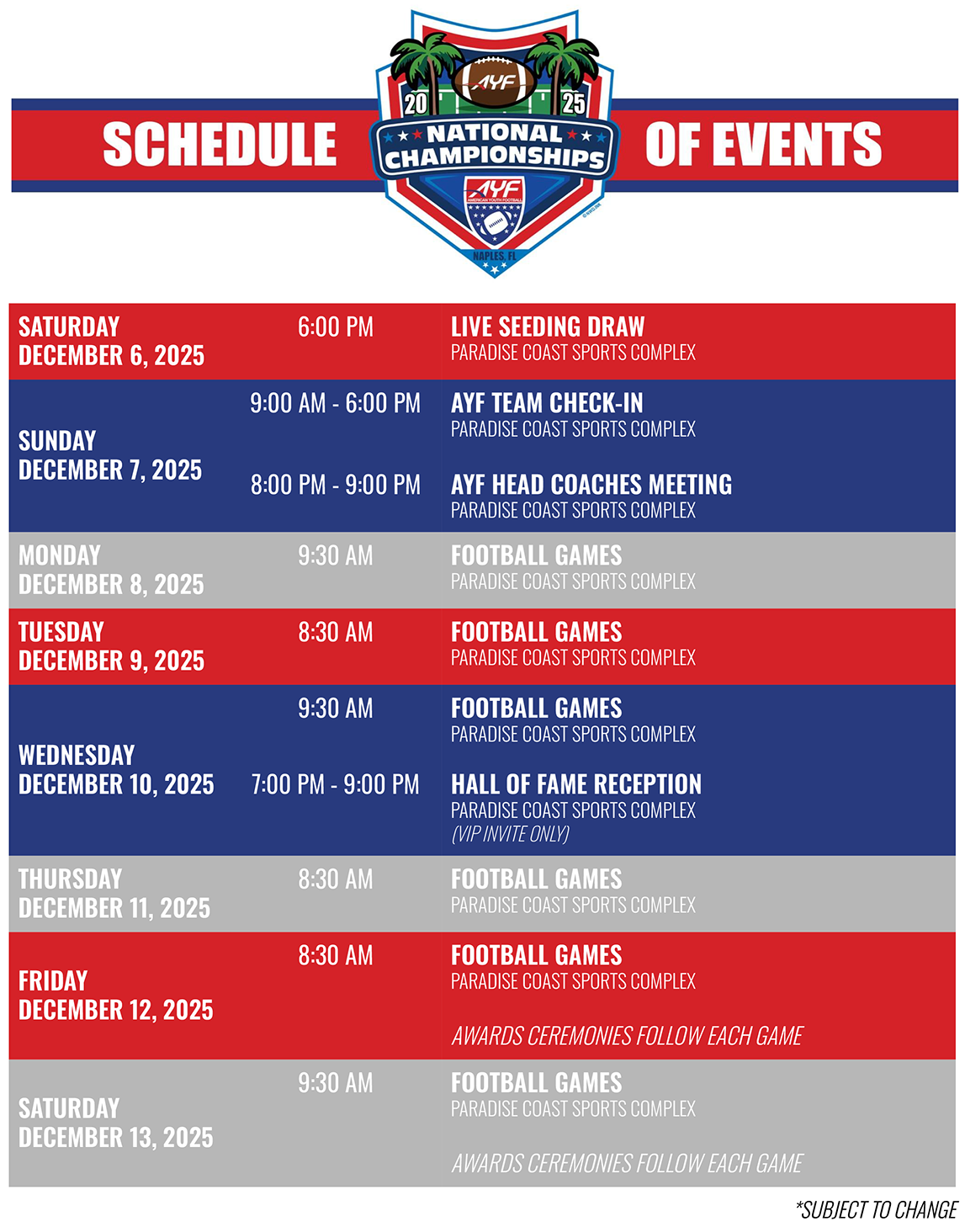American Youth Football and Cheer is proud to recognize its past champions and congratulates everyone who has advanced to the National Championships. Join the excitement and catch all the action.