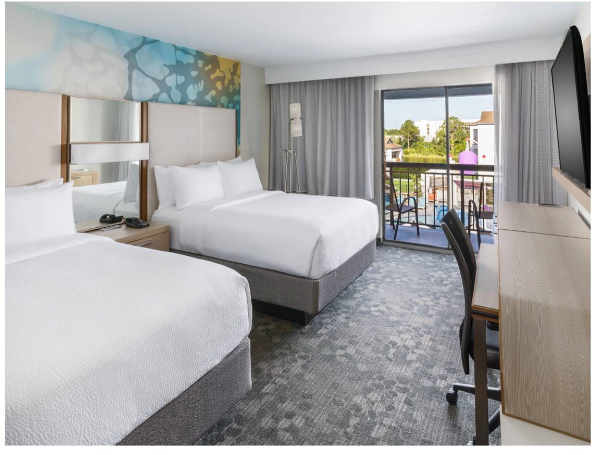 NEWLY REDESIGNED UPSCALE WALT DISNEY WORLD GOOD NEIGHBOR HOTEL® offering complimentary shuttle service to Walt Disney World® Resort transportation center. Our convenient location is prime to Austin Tindall Park, Disney Springs®, SeaWorld Orlando®, Universal Studios® and walking distance to 25+ restaurants. Following a day of tournament fun, find solitude in your spacious hotel accommodations featuring plush Queen/ Queen bedding, mini refrigerator, complimentary Wi-Fi and a large 55” Roku® TV with Netflix streaming entertainment. Visit The Blend, proudly serving Starbuck’s® and delicious ice cream. Our Crate Market, also has all of your favorite beverages and snacks, and is open 24 hours a day. For more fun in the sun, head to one of our two sparkling outdoor pools, featuring pool side cabanas, splash pad and Oasis Patio & Lounge. Get more of what you came for at Courtyard Orlando Lake Buena Vista at Vista Centre.