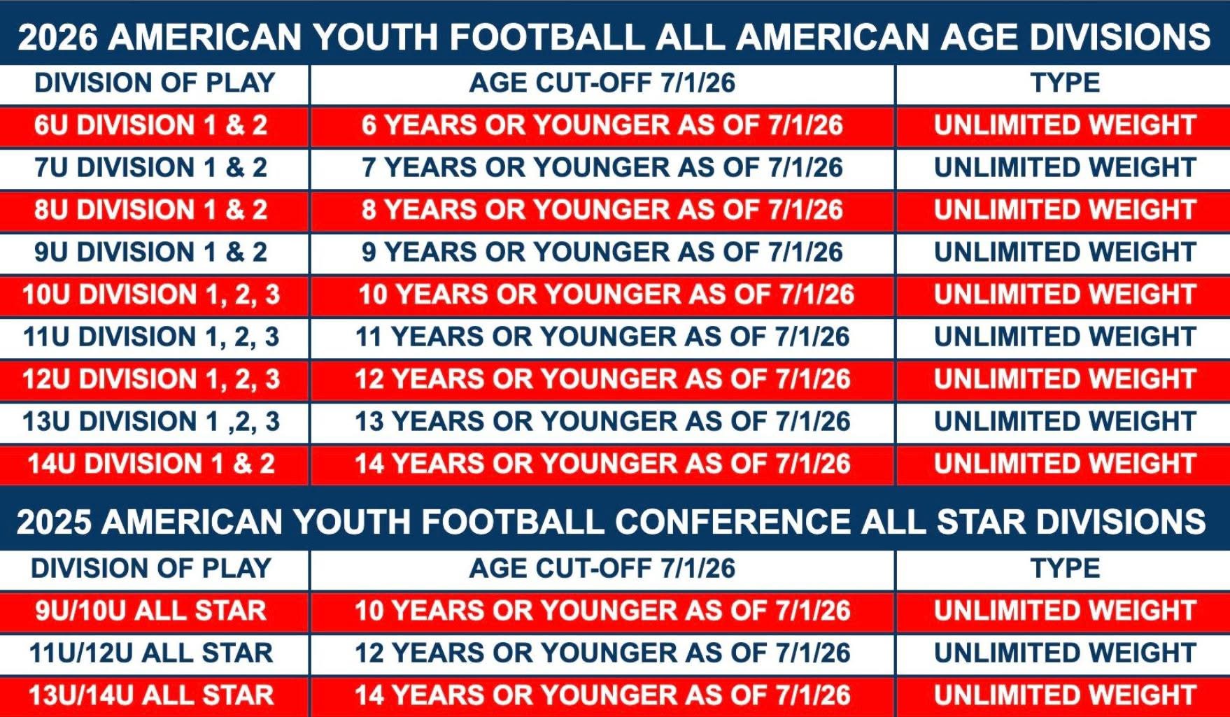 There are no age, weight, or height restrictions. This is skill-based play. Find Inspiration divisions and rules at MYAYF.com.